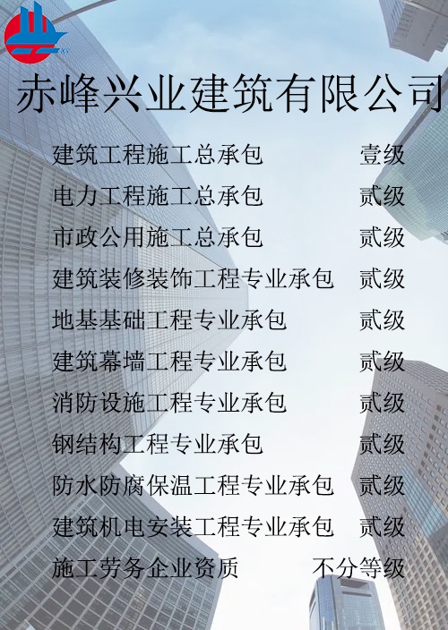 赤峰興業(yè)建筑有限公司簡介 赤峰興業(yè)建筑有限公司成立于1998年7月,位于內(nèi)蒙古赤峰市松山區(qū)?,F(xiàn)已發(fā)展成為擁有建筑工程施工總承包壹級、電力工程施工總承包貳級、市政公用工程施工總承包貳級、承裝、修、試四級、?建筑裝修裝飾工程專業(yè)承包貳級、建筑幕墻工程專業(yè)承包貳級、消防設施工程專業(yè)承包貳級、地基基礎工程專業(yè)承包貳級、鋼結(jié)構(gòu)工程專業(yè)承包貳級、建筑機電工程專業(yè)承包二級、防水防腐保溫工程專業(yè)承包貳級以及建筑施工勞務等資質(zhì)的綜合性建筑施工企...